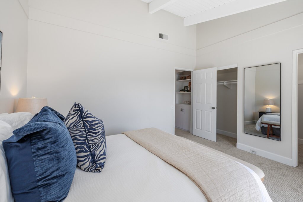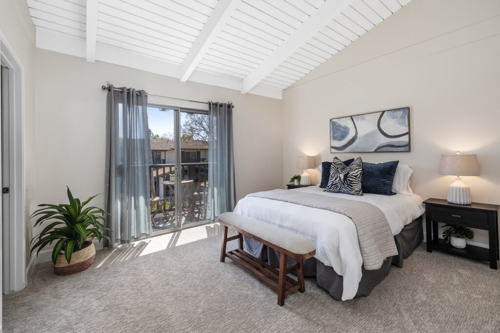 The entire interior has been recently repainted and new decorative lighting fixtures added. Upstairs, the bedrooms feature vaulted wood-beamed ceilings, abundant natural light, and thoughtful details throughout. The primary bedroom offers a private balcony, walk-in closet, and an additional traditional closet. Secondary bedrooms are bright and include mirrored closet doors.