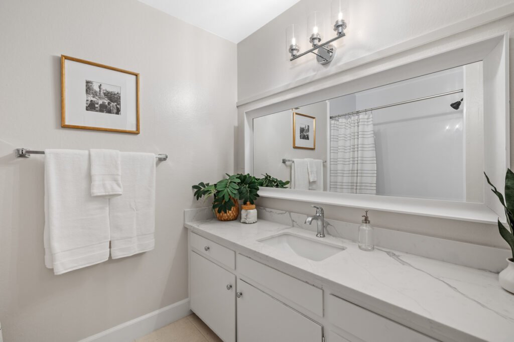Newly refinished bathroom with subtle Turrazzo tile flooring and brand new marbled counter top, decorative mirror, lighting and new sink and faucet.