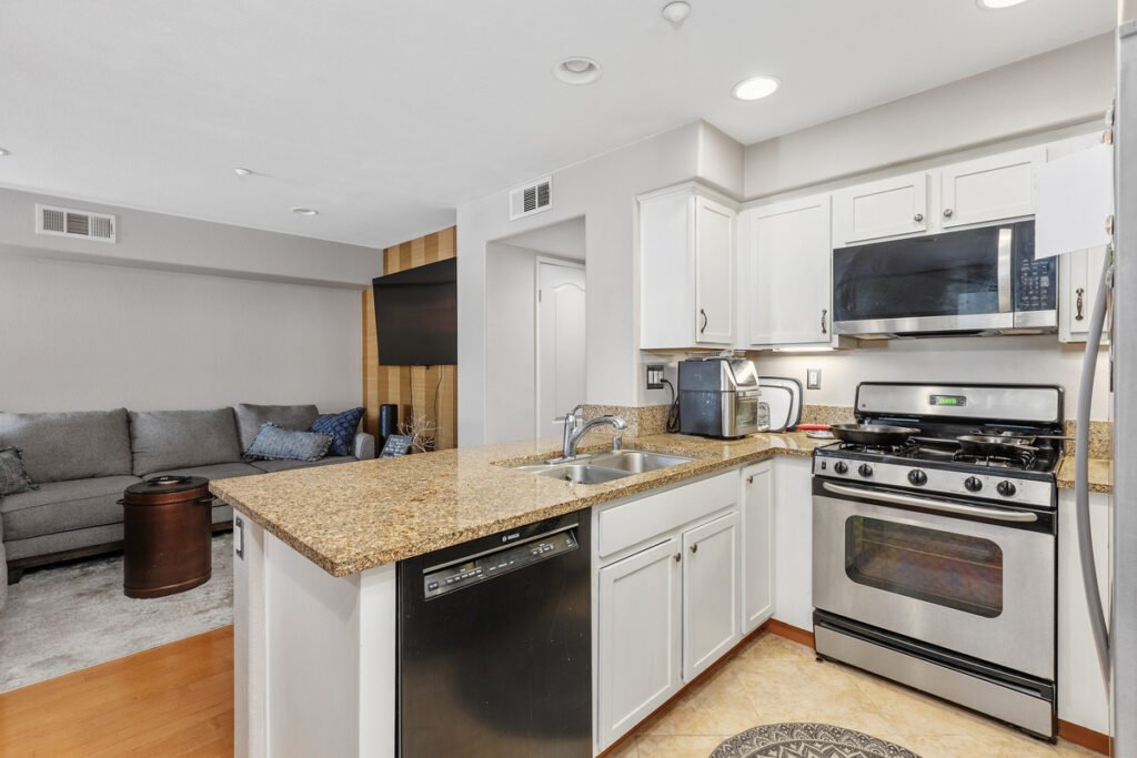 Natural hardwood floors, complemented by travertine tile in the entry, kitchen, and baths, and carpeted bedrooms & stairs. The kitchen features granite countertops, stainless steel appliances that convey, and timeless wood cabinetry, opening seamlessly to the dining area with a custom built-in hutch. Step outside to the private balcony and take in unobstructed views of the pool and community—perfect for morning coffee or unwinding at the end of the day.