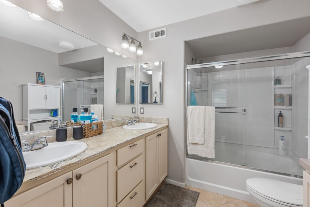 Down the hall, you’ll pass a full size washer/dryer on the way to your primary suite offering a calm retreat with ensuite bathroom – dual vanities, a glass-enclosed shower, soaking tub, and double closet areas with mirrored closet doors.