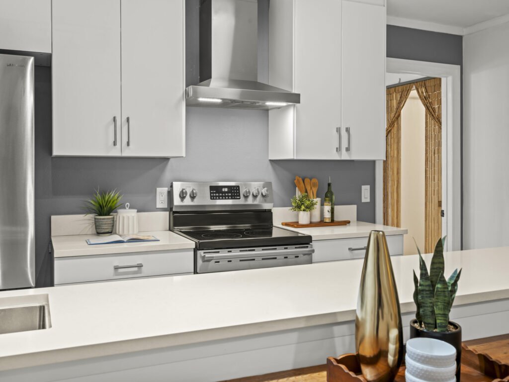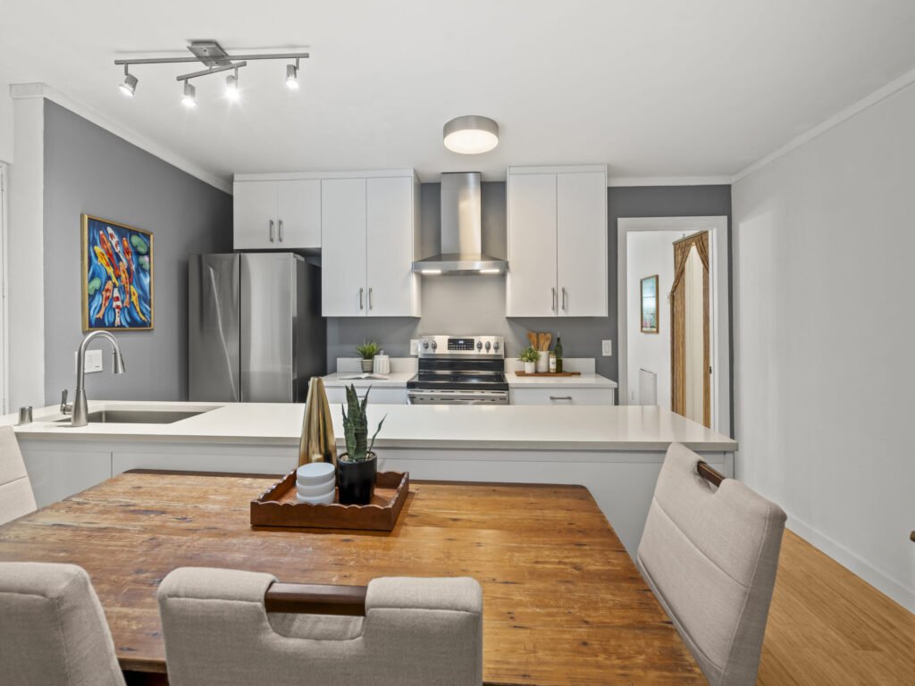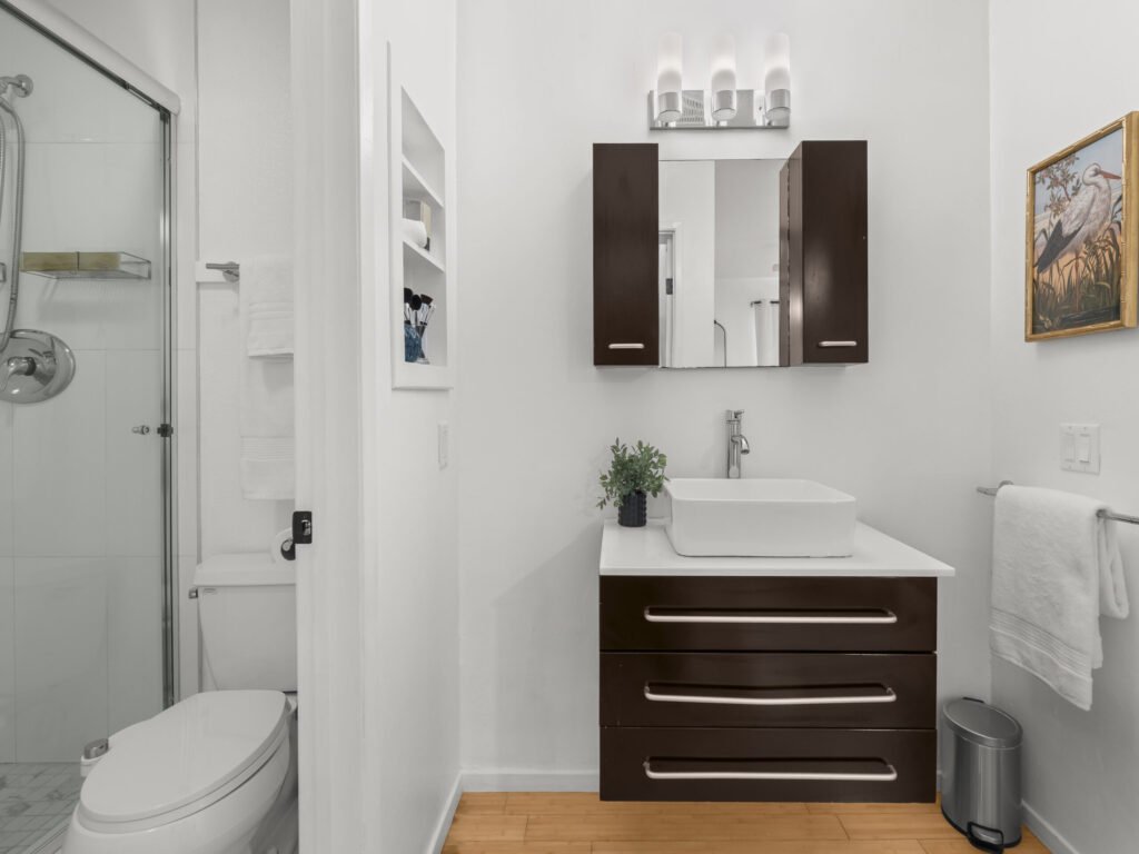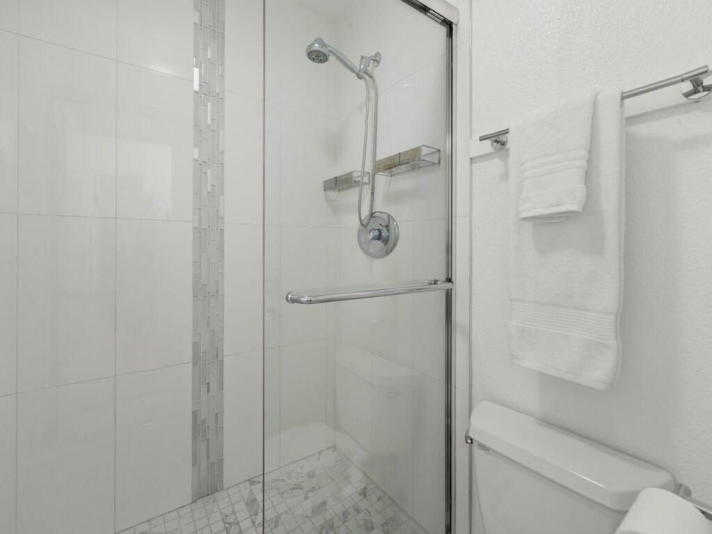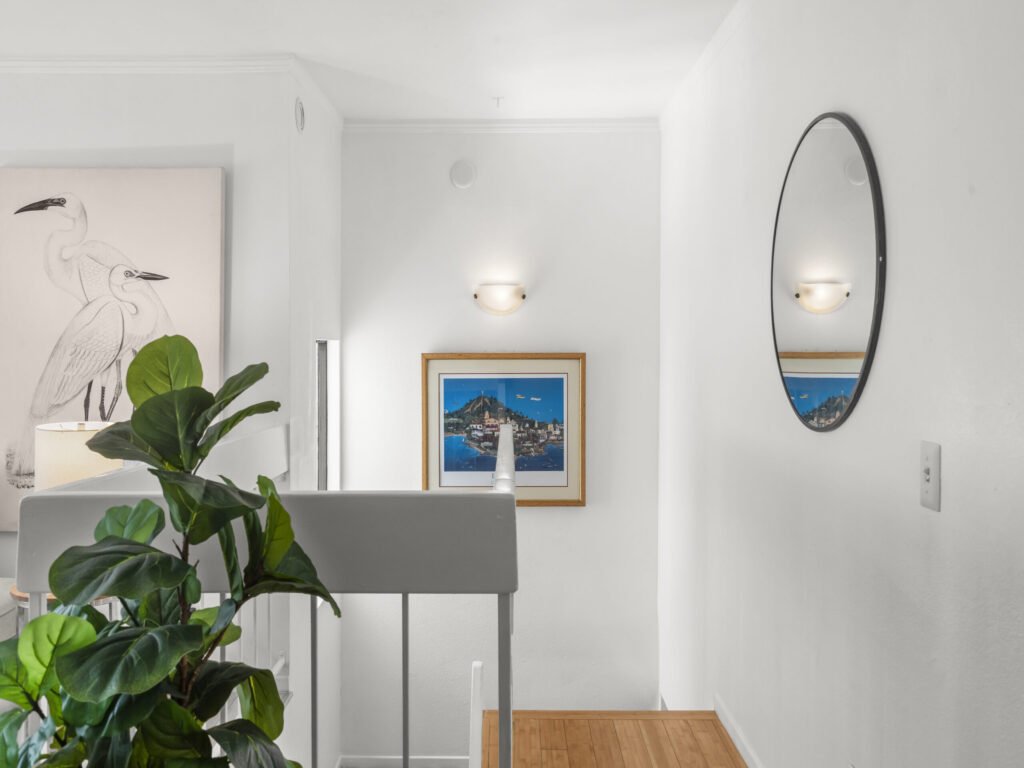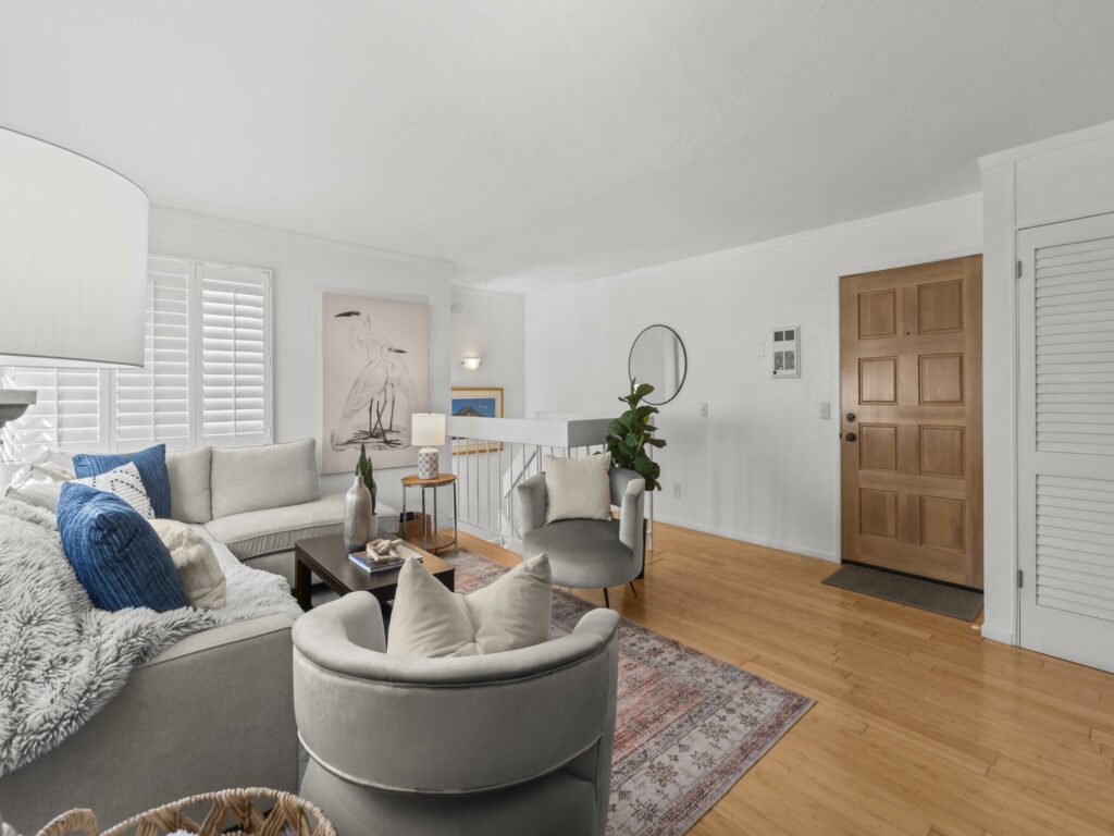 The thoughtful split-level layout leads down to the lower level, where a newly updated kitchen and open dining area create the perfect gathering space for friends and family. Two spacious primary suites are designed as a tranquil retreat; one offers direct access through sliding glass doors to your exclusive-use patio, where you can enjoy peek-a-boo bay views and the lush green park.
