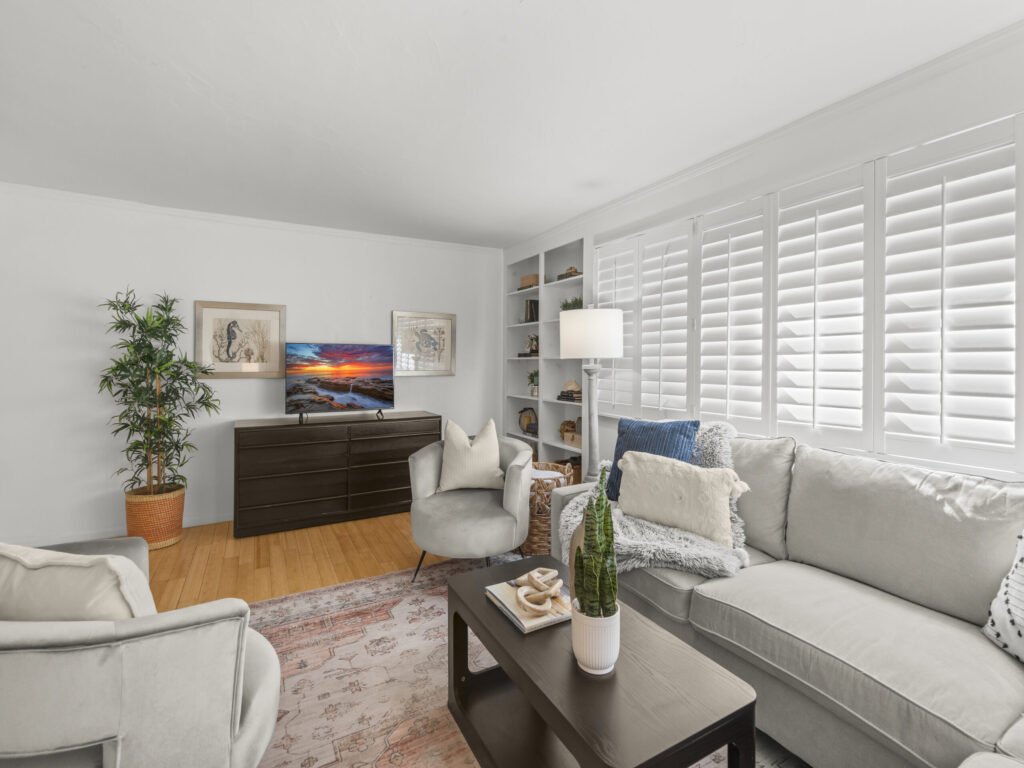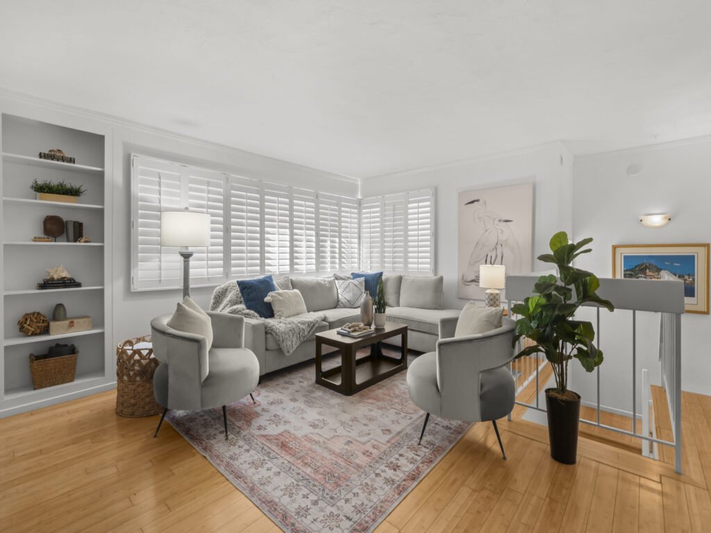 The entry level welcomes you with a spacious, light-filled living room featuring bamboo hardwood flooring, white plantation shutters, built-in shelving, and a discreet wet bar—ideal for entertaining after a day on the water.