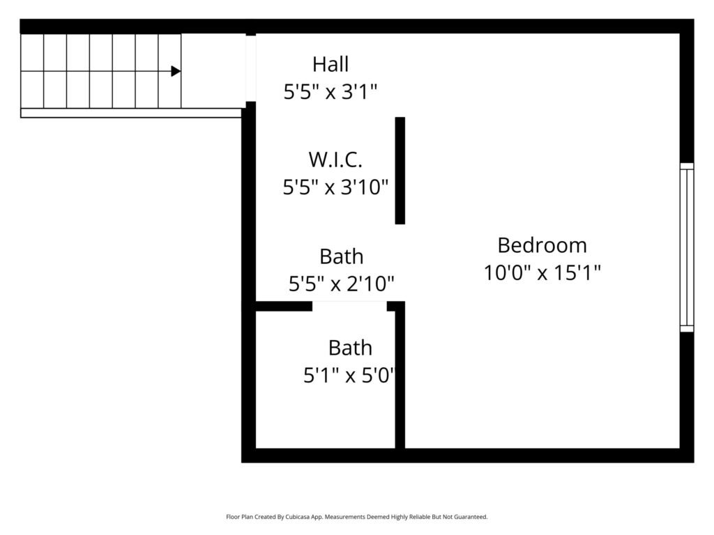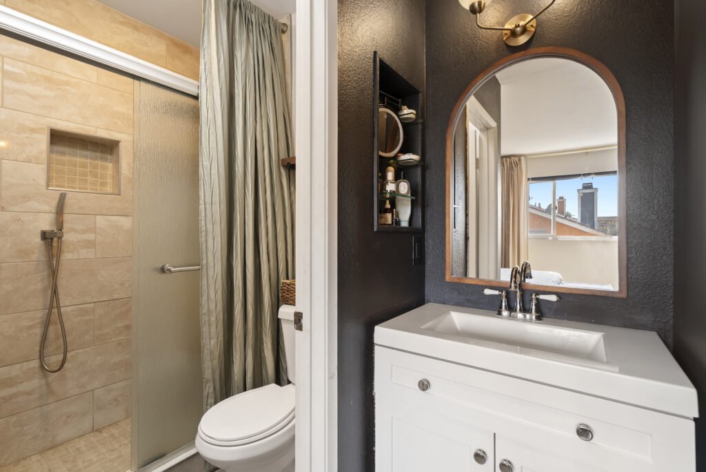 Upstairs, the bedroom is a proper retreat with a dramatic accent wall, generous natural light, and access to a walk-in closet that has been upgraded with a custom organization system. The bathroom is shower-only, an arched wood-framed mirror, and brushed gold fixtures. One parking space plus a private garage space are included.