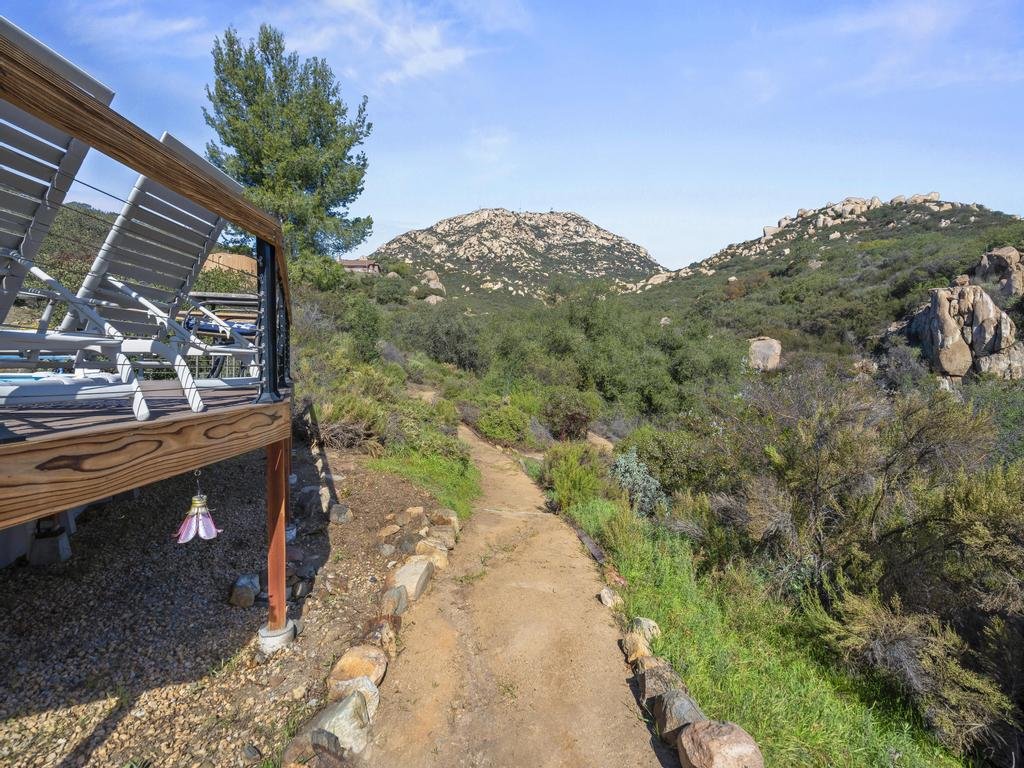 Just 15–20 minutes from Jamul’s business core, this nearly 10 acres in an elevated highlands enclave, delivers a rare balance of accessibility and true retreat. Perched high above the valley with sweeping panoramic views, the property lives like a private, nature-wrapped escape, serene, hidden, and deeply restorative. Beyond the automatic gate, a long private drive leads to generous parking and a rustic, winding path that sets the tone for the home’s warm, tucked-away arrival.