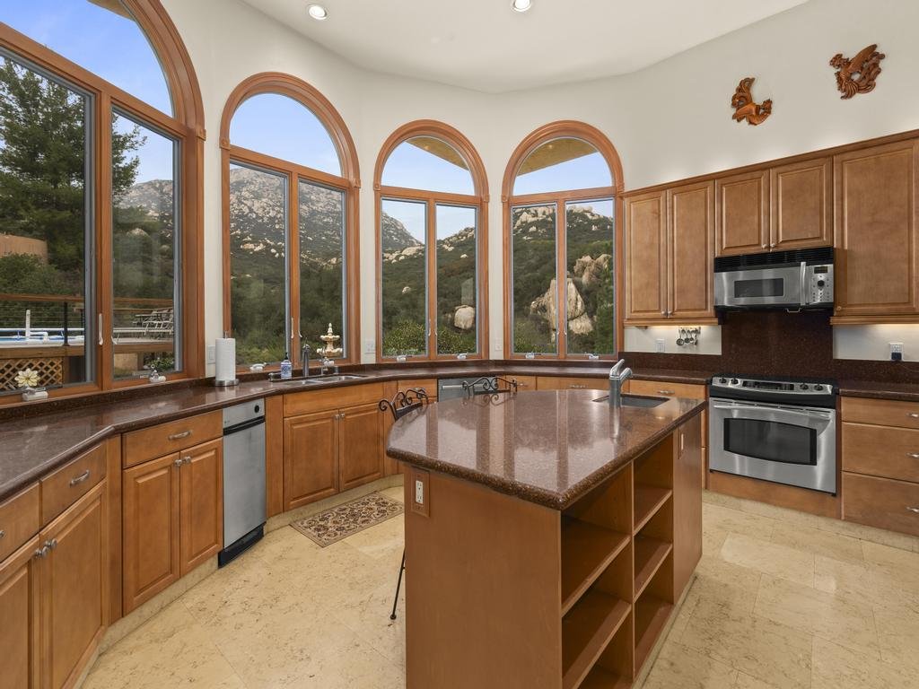 Inside, soaring ceilings and expansive sight lines open to a grand, light-filled living room where oversized windows frame the picture book valley panoramas, while the adjoining kitchen is backed by a dramatic wall of tall windows capturing the natural rockscapes behind, including views toward Lyon’s Peak. Both the living room and kitchen flow into a country-style dining room that serves as the true heart of daily living and gathering.